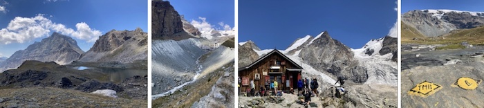 - Da Plan Maison ritorniamo al Lago Goillet e, riprendiamo il Tour del Monte Rosa (TMR), stavolta in direzione sud ovest, fino ad imboccare la Gran Balconata del Cervino (Sentiero 107), che arriva da Cervinia e scende lungo tutta la Valtournenche